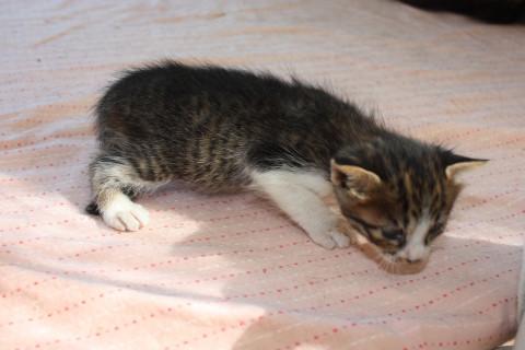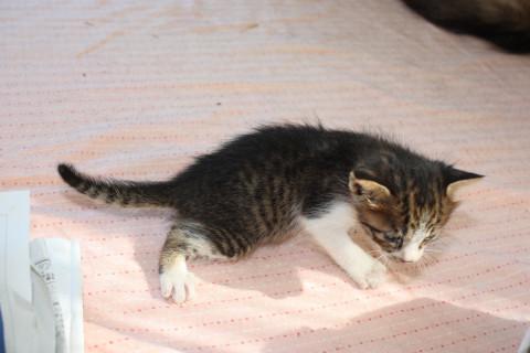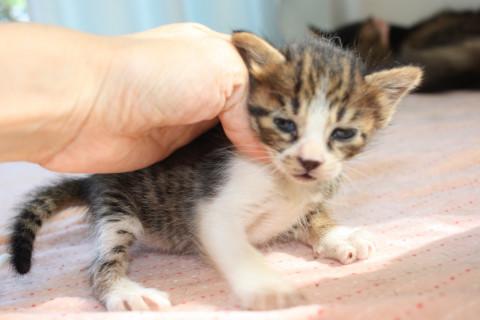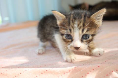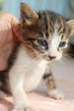 可愛い赤ちゃんキジ白、えりざべーとちゃんです。食欲旺盛でコロッコロのコロコロです。性格はまだ小さいのではっきりわかりませんが、ミルクから育てているので大変人懐こくなります。活発で元気に遊びます。