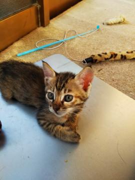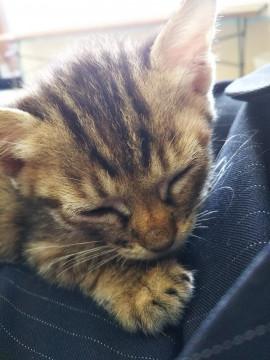 綺麗なキジトラ柄です。しっぽはまっすぐで姉妹のひびきちゃんとよく似ています。