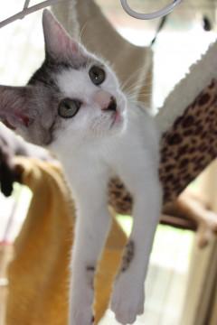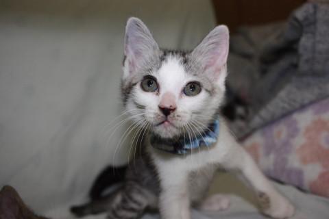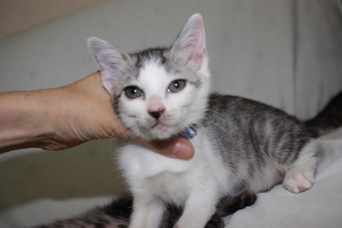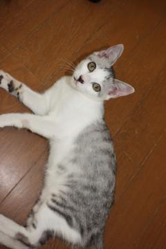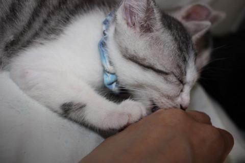 可愛いサバ白、三日月ちゃんです。赤ちゃんの頃はお母さんの乳首が恋しくて、自分の腕や兄弟のお腹を吸っていましたが、今は人の指や腕をチュッチュするのが大好きで、それはそれは情熱的にチュッチュしてくれます。コバンザメのようにどこにも付いて来て、歩いている足にもチュッチュしてきます。