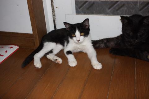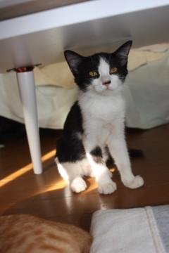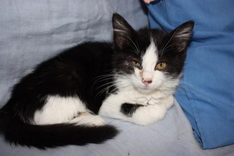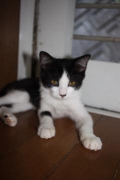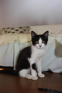可愛い黒白ハチワレ、ぐろりあちゃんです。お写真ではまだ結膜炎が残っていますが、現在ほぼ完治していてスッキリきれいになりました。最初だけ人見知りすることもありますが、大変人懐こく一緒に寝たり、ついてきてくれたり、お手伝い(邪魔)してくれたりとても可愛らしい子です。他の猫ちゃんにもフレンドリーです。尻尾の根元の白い模様がチャームポイント。