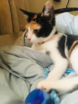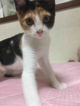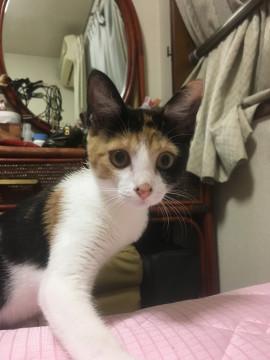 メスの三毛猫ちゃん、とても甘えん坊です。狭いところが大好きで、カーテンの後ろに隠れて、よく驚かして楽しんでます。