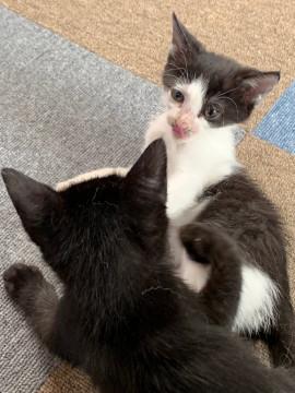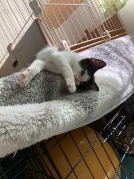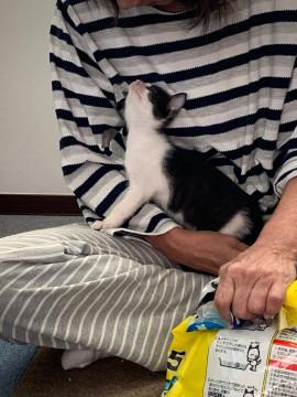 3兄弟で保護した内の1匹になります。唯一の女の子です。ミルクから人の手で育てているため、人に対して警戒心ゼロで甘えてきます。人の目を見る子で、何かあると首をかしげてきて、お顔で突進してくるので、ちょっと危なっかしいです。