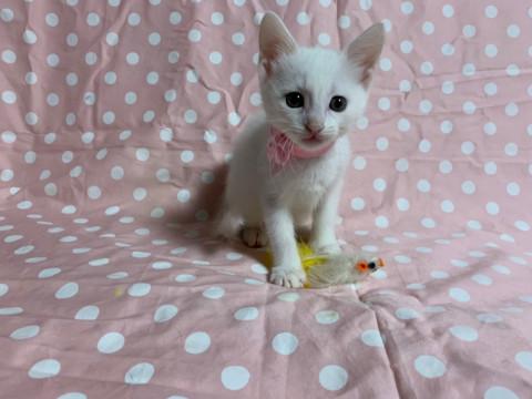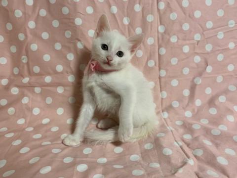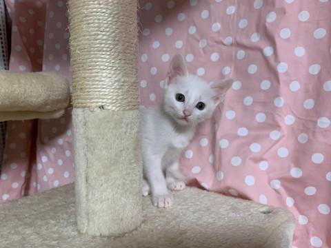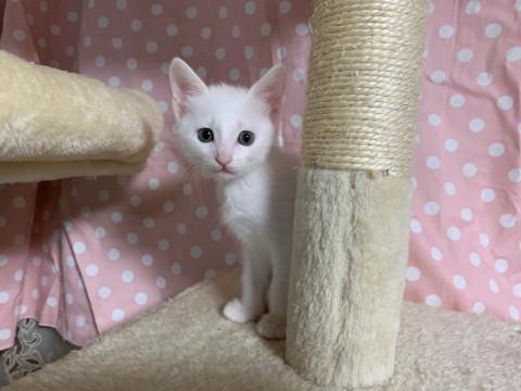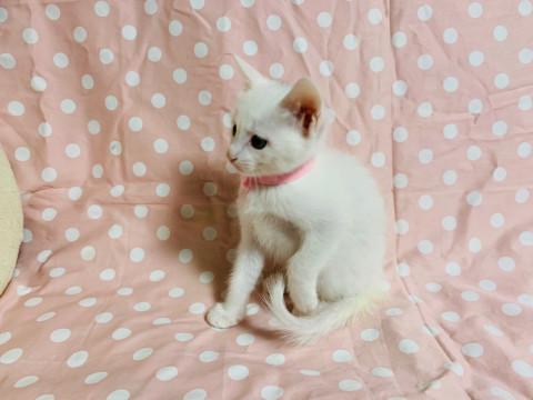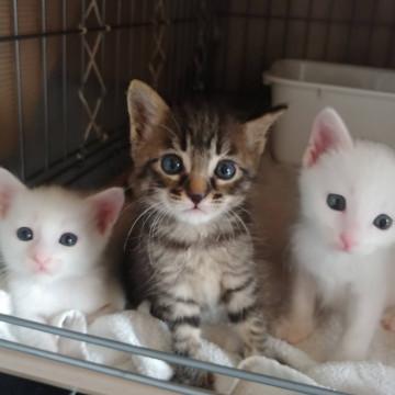 中毛のように見受けられます。白猫で頭に少しだけ黒い毛があります。三兄妹は仲良く過ごしており成猫とも友好的です。最後の写真は三兄妹の写真です。