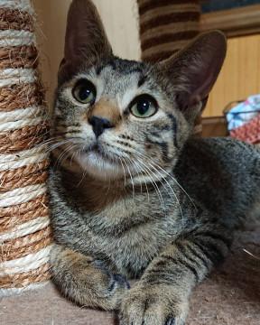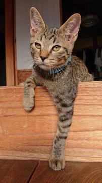 交通量の多い国道を手押し車で歩いているおばさん。よく見ると子猫を連れていました。あまりに危なげなので声をかけ、色々話し聞いているうちに、仔猫三匹とお腹の大きいお母さん猫がいるとのこと。避妊手術はしなくてはならないけど、どうしていいかわからないとのこと。このままでは多頭飼い崩壊になってしまうと思い、避妊手術、里親募集を引き受けました。人懐っこく膝上にのって甘えたり横でくっついてきたりとてもかわいいです❗