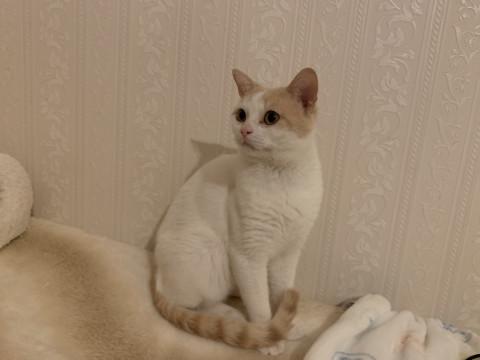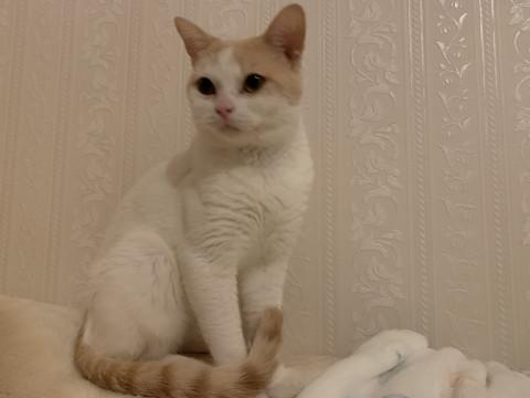 茶白です。瞳が大きく綺麗です、しっぽは真っ直ぐです。今は痩せていますがふっくらすれば、更に美猫になると思います。