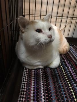ずんぐりむっくり、でかい!というのが、第一印象になるかと思います。7~8キロあるかと思いましたが、実際には6.3キロでした。白の多い茶白で、尾は長いです。