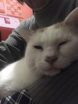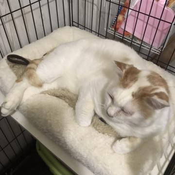いつもは、お気に入りのベッドで寝ていますが、抱っこが大好きで膝の上で寝てしまいます。長時間はしびれます(笑)。本当に野良猫かと思うくらい人慣れしています。撫でると、ず~~~~っとゴロゴロ言ってます。体のわりに臆病さんで、驚くことがあると、一目散に自分のゲージに避難します。そのギャップが溜まらなく可愛い子です。殆ど寝ている事が多いので、猫が居てくれるだけで幸せ~という方でも、充分家族になれると思います。とても平和主義で、他の猫に喧嘩をふっかけられても、やりかえしたりしない子です。性格抜群によい子です。