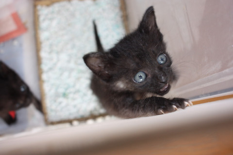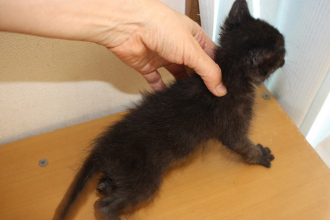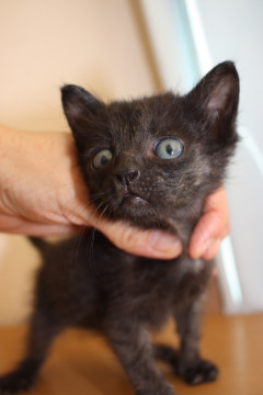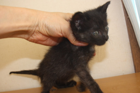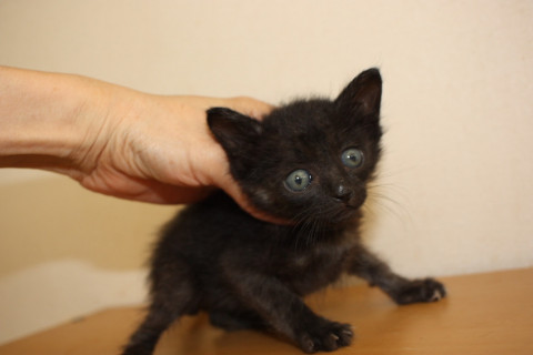 可愛い赤ちゃん黒猫、ほーく君です。クリクリお目目がとってもキュート。性格はまだ小さいのではっきりしませんが、目が開いていない時からミルクで育てているので大変人懐こくなります。とても元気で活発に育ちそうです。
