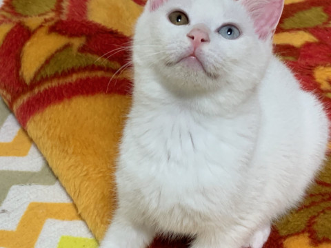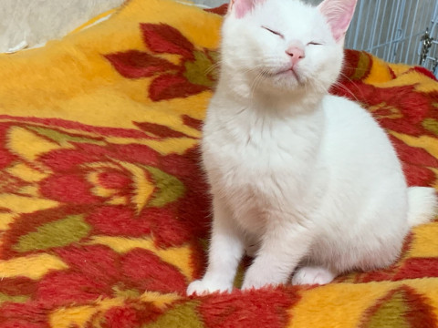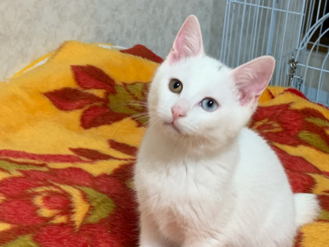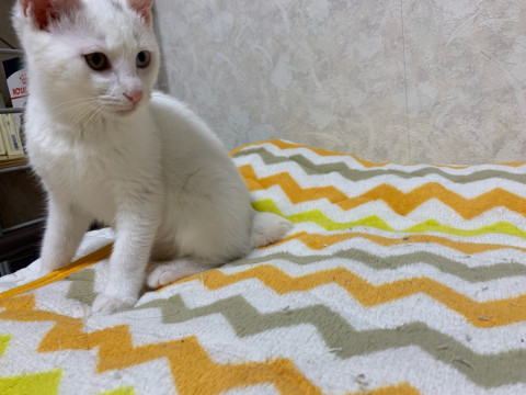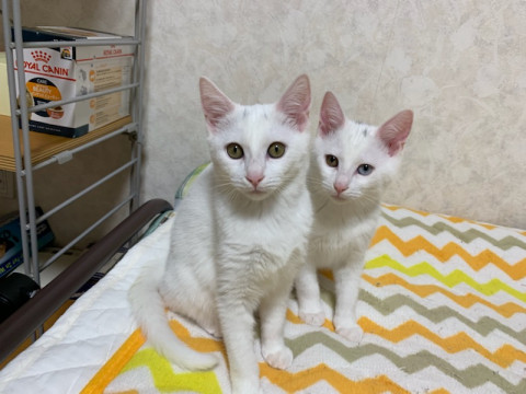 真っ白い猫・・・頭に二筆分のラインあり。オッドアイ。シッポがくるんと短く豚シッポのよう。姉弟は仲良く日々を過ごしています。成猫とも仲良しです。すこし恥ずかしがり屋なのでゆっくりと家族になっていただけるご縁を願っています。