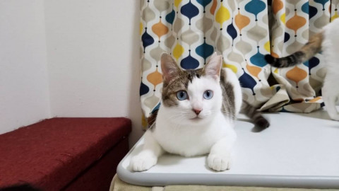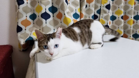 ちょっと珍しいキジ白×青い目の組み合わせ!体の柄は世界地図のよう。抱っこが大好きで赤ちゃん抱きすると顔をフミフミされます♪