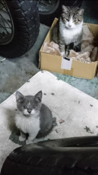 グレー白(メス3~4ヶ月)はまだビビリです。サバ白(オス4~5ヶ月)は小心者ながらも人間には信頼を置いております。2匹揃って家猫修行中です。頑張っておりますので、どうかよろしくご検討ください。2匹一緒なら、大変な幸せですが、1匹でも譲渡可能です。