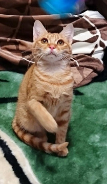 茶トラの正統派美人さん。甘えっこで、まだまだ子猫らしく毎日がサーキット、ダメな事は「ダメよ!」と言うとダッシュで逃げるお茶目なところも(^^)
