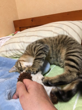 丸々とした身体とふわふわな毛で抱き心地バツグン。遊びたくて堪らない様子。保護時から耳の中もピカピカで爪を切った跡があり。警察に問い合わせてみましたが届けは無く、遺棄されたのかもしれません。歯は未だ細い乳歯ですが腹周りの脂肪でまるでおっさん。
