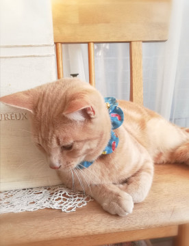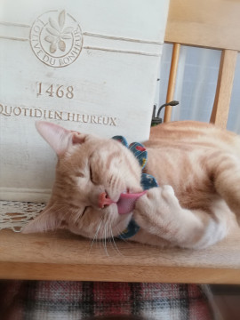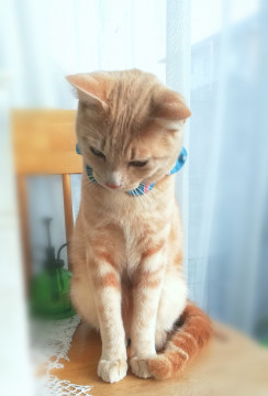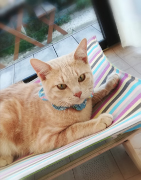 保護当時、べたべたな甘えん坊さんでしたが、去勢手術後、 少し大人になったのか最初のうち人見知りするようになりました。でも、しばらく一緒にいると馴染んできて抱っこも平気になります。猫じゃらしであそんでやると大喜びします。ちょっと調子乗りなところがある男の子らしい猫ちゃんです。