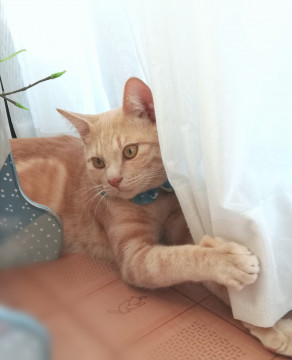 きれいなクリーム色のクラシックタビーの男の子です。陽気で快活、先住ペット犬も猫も大丈夫で共存できます。