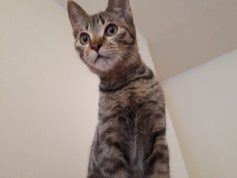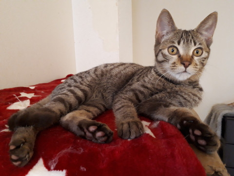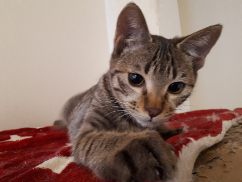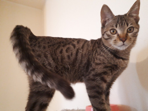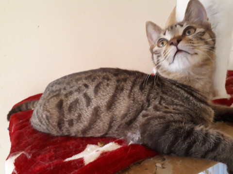 ベンガル風の斑点が入った、薄茶色のキジトラ柄。