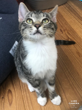 黒が強いキジシロで、イカ墨を食べたような(笑)、口元の黒いところがチャームポイント❤︎