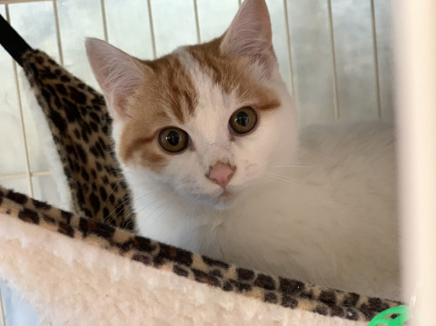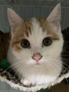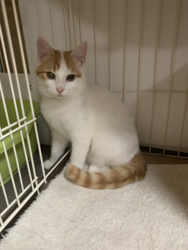 白ベースに薄い茶色柄。お目クリクリとっても可愛らしいしもっち〜ちゃんです。尾尻長くきれいです。ご飯時には1番前に出て来て催促。チュール大好きなこです。ほぼ、野良猫ちゃんに育てられたので、まだ少し怖がりますが馴れは早いと思います。先住猫ちゃんいる方希望です。1匹飼育の方はご相談ください。