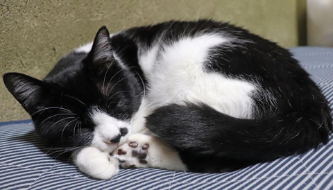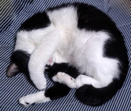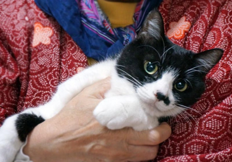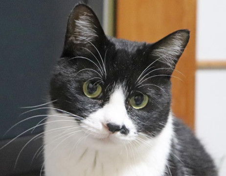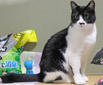 白黒のハチワレです。とても人に馴れていて、飼い猫だったと思われます。ときどきは布団で一緒に寝てくれます。トイレの失敗はありません。