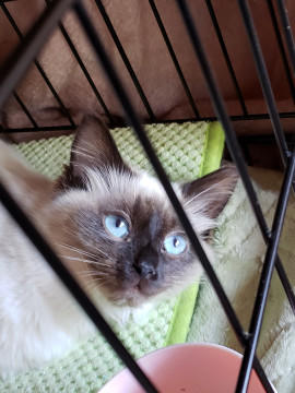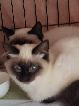 シャム系の少し毛足の長い女の子です。瞳はきれいなブルーです。人には良く慣れています。