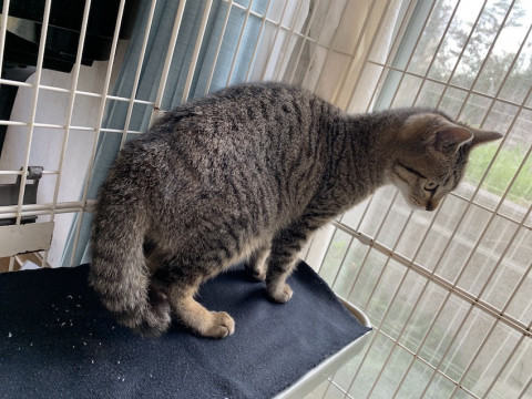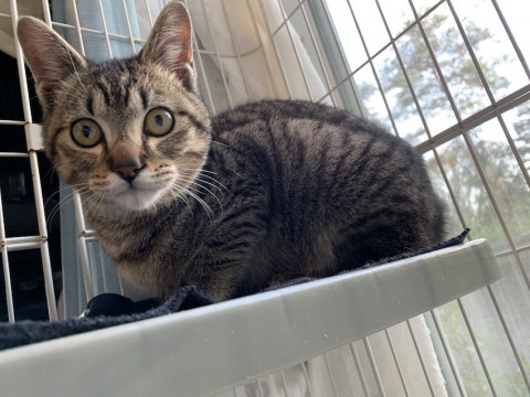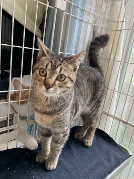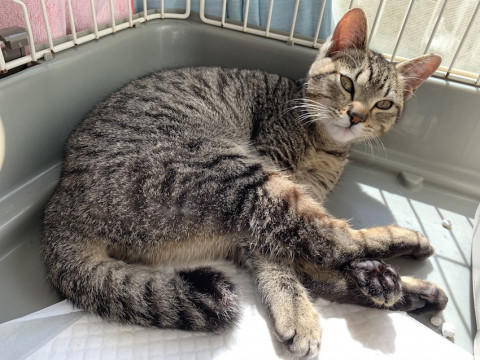 可愛いキジトラ、ぶんぶくくんです。丸顔と ぶつっと切れたようなたぬき尻尾がチャームポイント。センターで長らく1匹で過ごしていたので、ほかの猫ちゃんとの距離感がまだつかめないところがあるようですが(仲良くなるのに時間がかかる、一旦仲良くなると怒られても遊んでもらいたがるのでウザがられる)、子猫なのですぐに学習してくれることと思います。大変人懐こいです。