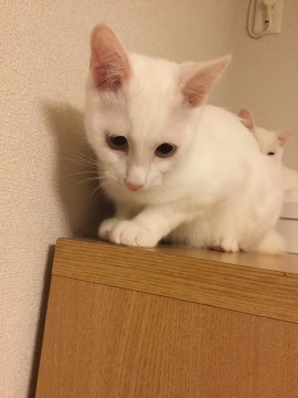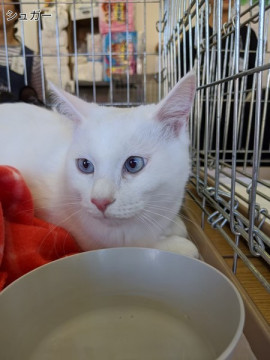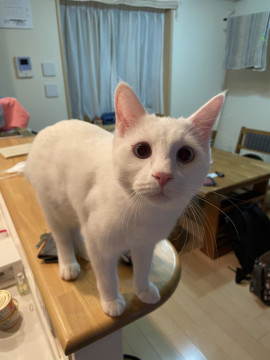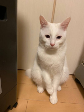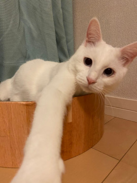 白い毛並と青い目が魅力的ですが、尻尾だけ少し黄色味がかかっているます。肌触りはフワフワしてうさぎの様です。