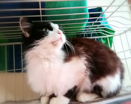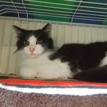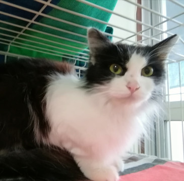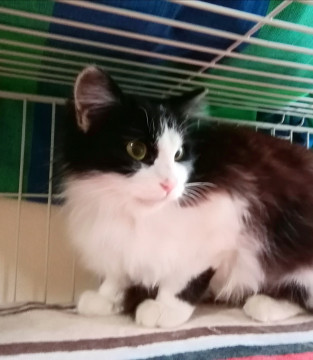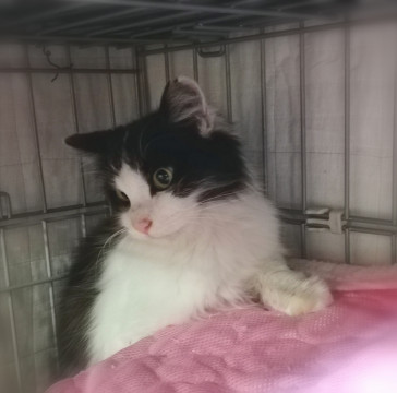 黒白のふんわりやわらかな長毛の女の子です。推定年齢一歳くらい。