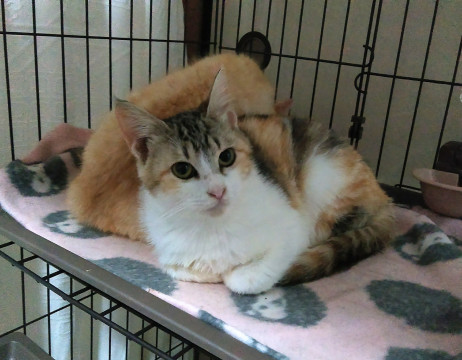野良猫が子供を生んでいると保護団体に相談がありました。後ろ右足を痛めていたので保護して治療しました。ケージ内ではお腹を見せるなどゴロゴロですがケージから出すとパニックになります。人慣れ場所慣れは早期にできると判断しリターンせず里親募集をすることにしました。