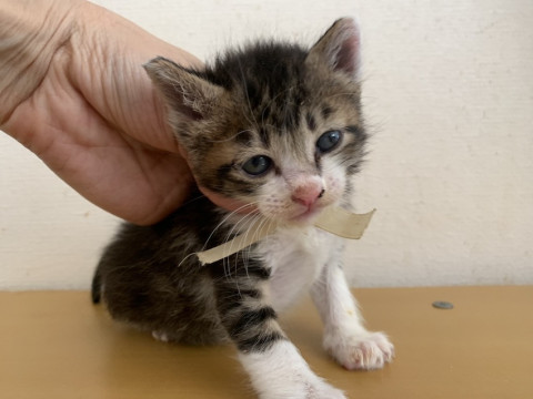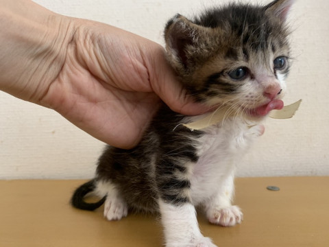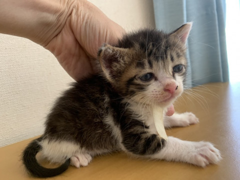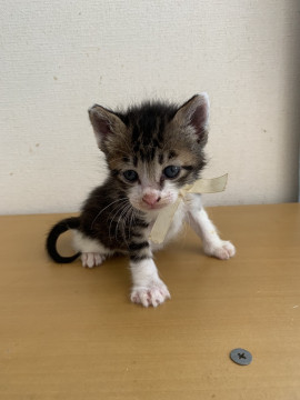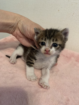 可愛いキジ白、まーてぃん君です。まだ小さいので性格ははっきりわかりませんが、ミルクから育てるので大変人懐こくなります。