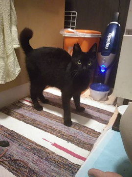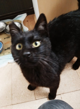 黒猫。結構、激しくよく遊ぶ。甘えん坊。幸運のカギシッポ。耳カットしています。とても人慣れしていますが、猫慣れもしているも思われますが、人との接し方がよく分からないみたい。キチンとトイレで、出来ますので、長~い目で見守って下さい。先住猫居ても大丈夫かなと思います。