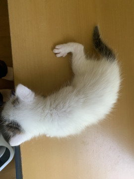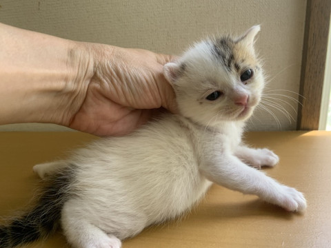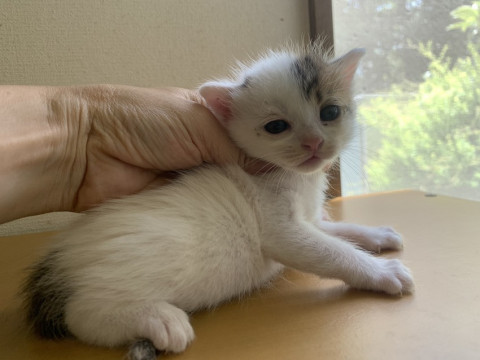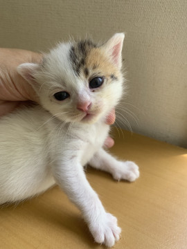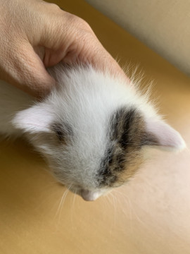 可愛いキジ白、ちゃちゃちゃんです。兄弟の中では一番食欲旺盛です。まだ小さいので性格ははっきりわかりませんが、ミルクから育てるので大変人懐こくなります。