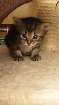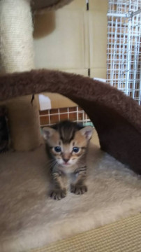 キジトラですが、アメショー柄の毛並みです。しっぽがとても短く、これも魅力の一つです。