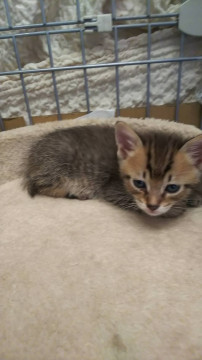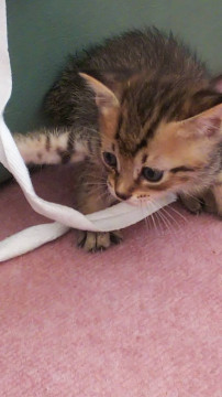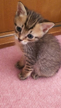 野良さんが軒下で赤ちゃんを産んだようです!とヘルプの連絡が入り、母猫共に保護しました。子育て支援をし、、ママのおっぱいですくすく育っています。薄めのキジトラで優しい色合いです。