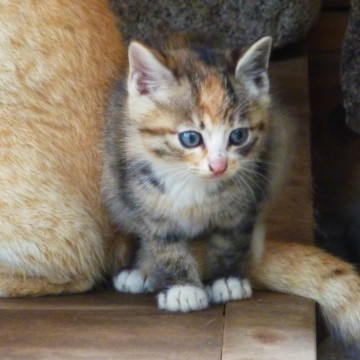 推定4月上旬生まれ、4兄弟の1匹、三毛猫です。
