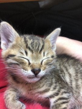 少し明るい茶色の混ざったキジトラで、鍵しっぽの男の子です。