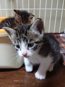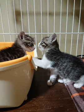 今はまだ兄妹で仲良くじゃれあって遊んでいます。子猫の健やかな成長のため、2ヶ月間の社会化期が過ぎてからの譲渡とさせていただきます。