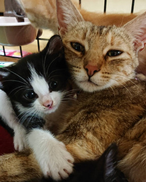 知り合いのお友達の家で野良猫が赤ちゃんを産み、その家では飼うことが出来ず、保健所に連れていくと聞いて、私が預かることにしました。今は、母猫とこの子の兄妹五匹と一緒に暮らしています。