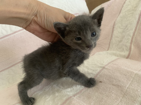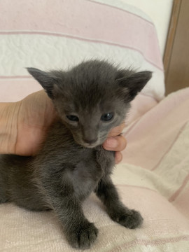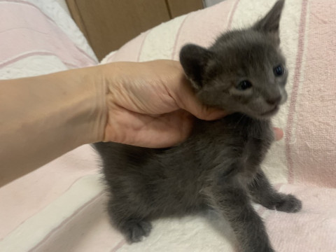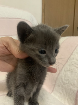 綺麗なベルベットのようなグレー、はるさめ君です。ちょっとオヤジ顔??まだ小さいので性格ははっきりわかりませんが、ミルクから育てるので大変人懐こくなります。