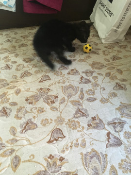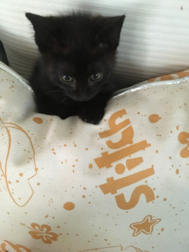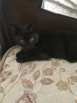 真っ黒尾尻長い男の子です。首したが少し白毛あります。お目が可愛らしく