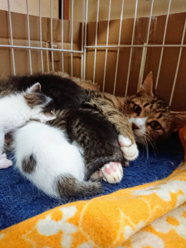 地域のとある会社に住みついた子が出産しました。困った会社の方が保護して連れて来てくれました。母猫は、手術してリリースする予定です。