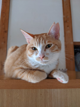保護した当初は人間が苦手で逃げ回っていましたが、今では足元をすりすりお世話をしていると体をこすり付けてくれるくらい馴れてくれました。