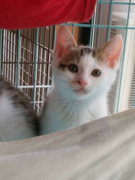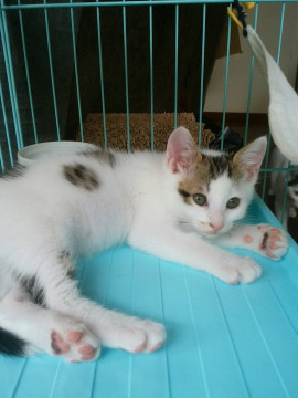 4月8日に民家の物置で生まれました。その家の人に母子猫ともに世話をしてもらい、生後3週目で保護しました。保護時から健康状態は良好です。