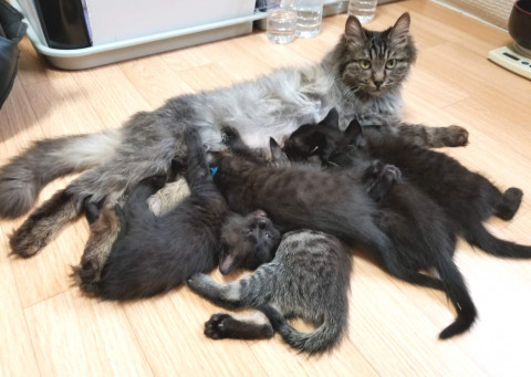 キジ柄長毛の母猫とまだ小さい5兄妹を保護し、