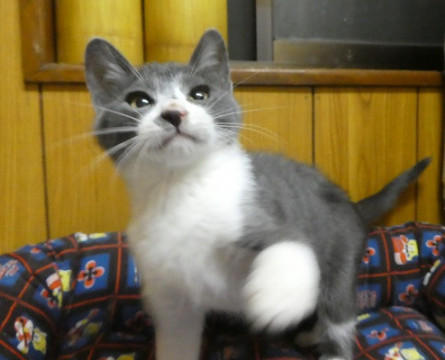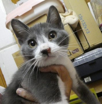 保護した3匹の中で身体が一番大きいお兄ちゃん。食欲もあり、いつも完食。元気です。