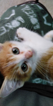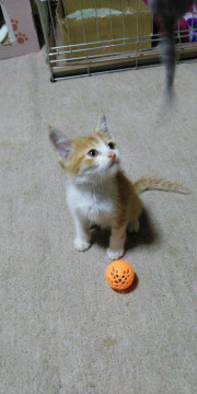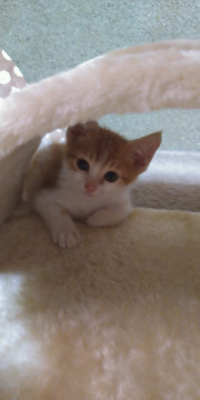 茶しろの可愛い子猫です。ちょっとタレ目が可愛い甘えたさんです。しっぽは、まっすぐで長いです。喉をゴロゴロならし、とても人懐っこいので、どなたにも、なつくと思います。初めての方でも、飼いやすいと思います。パウチやカリカリを食べています。トイレのしつけもできています。