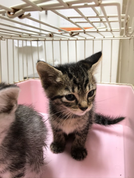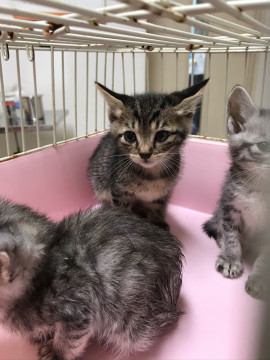アメショ混じりのキジトラ柄の男の子です。つぶらな瞳で見つめられるだけで、とても可愛い子です。人にも慣れています。一緒に保護した姉弟もおりますので、良かったら会いにいらしてください。