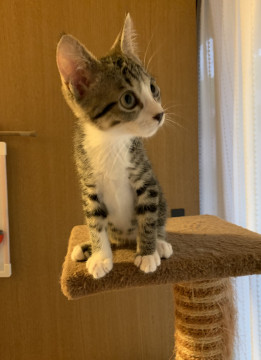 生後1か月くらいの子猫で、放置するとカラスにさらわれたり、車にひかれたり、自分では餌も食べられず、生きていけない様子だったため保護しました。