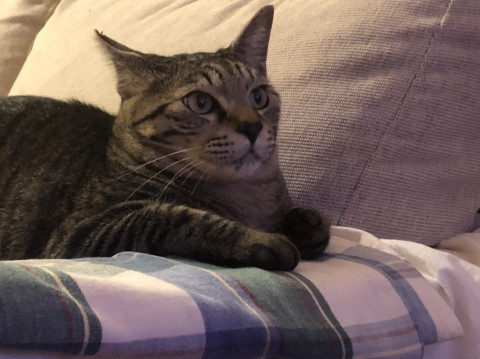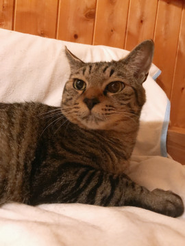 多頭飼育特有の人見知りのなさ。我が家に来てすぐに先住達とケンカせずに仲間にしてもらいました。キジトラなのに、鼻が黒いところが、チャームポイント。「ぱちこ」と呼べば「にやーん」と鳴きながら近づいて来ます。帰宅時は必ず出迎えてくれる保護主思いのねこ。(人とねこを超えた関係を築きます)