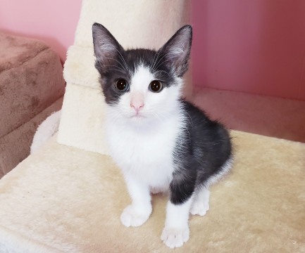 斜め前髪のようなハチワレと、ふんわり内巻き尻尾がとっても可愛いです♪