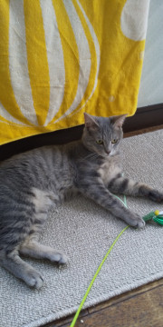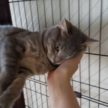 レアカラーな、グレーな毛色に薄いブラウンがかったサビ系のサバトラ男子です♂